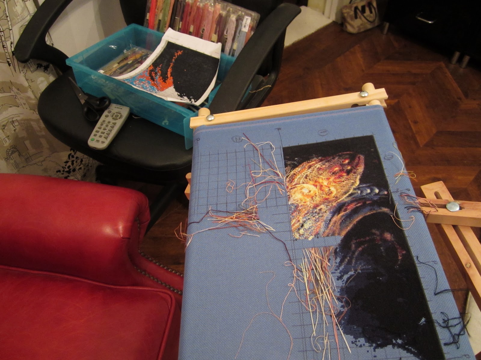 Over Christmas I stitched a lot on my HAED Maggy and I'm really pleased with my progress, although it's still impossible to really make anything out of the picture so far. I'm enjoying stitching this a lot. I'm trying to get it started all the way across the top section so I can start rolling it up over the scroll frames. I've made it a comfort blanket out of some batting to roll up with her with but I need some progress to roll!